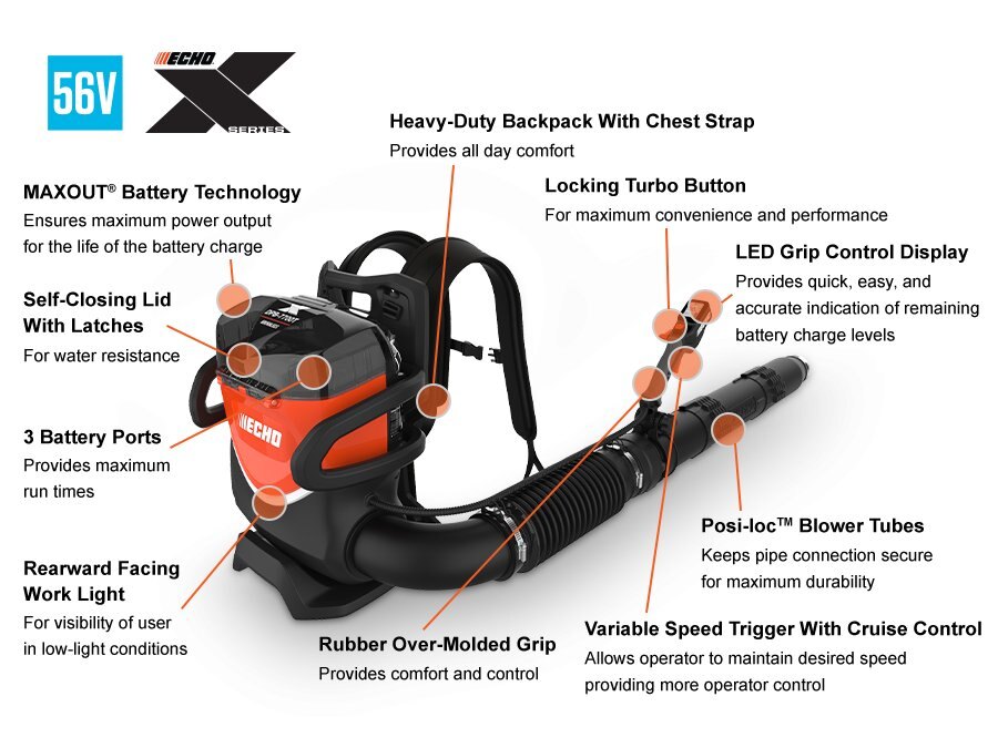 POWERFUL WITH ADVANCED LCD DISPLAY AND WORK LIGHTPowerful brushless motor Provides gas-like performance Turbo button boosts performance To 220 MPH, 850CFM and 36 N Three battery ports Provides flexibility to engage 1, 2, or 3 batteries simultaneously for extended run time and optimal performance Variable-speed throttle with cruise control Offers operator convenience and power control LED Grip Control Display Provides quick, easy and accurate indication of all three batteries Locking turbo button Delivers user convenience and maximum performance Rubber over-molded grip Increased comfort and control Heavy-duty padded backrest with chest strap For all-day comfort |